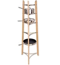A sleek storage tower of maple and brushed chrome for organizing cookware dinnerware or cooling pies. The stable triangular base smoothly slides into a corner or next to an island occupying a minimum of floor space. The six shelved rack is very easy to assemble. Ships in two boxes that are not oversized keeping freight charges to a minimum. A perfect companion piece to other J.K. Adams pot racks..